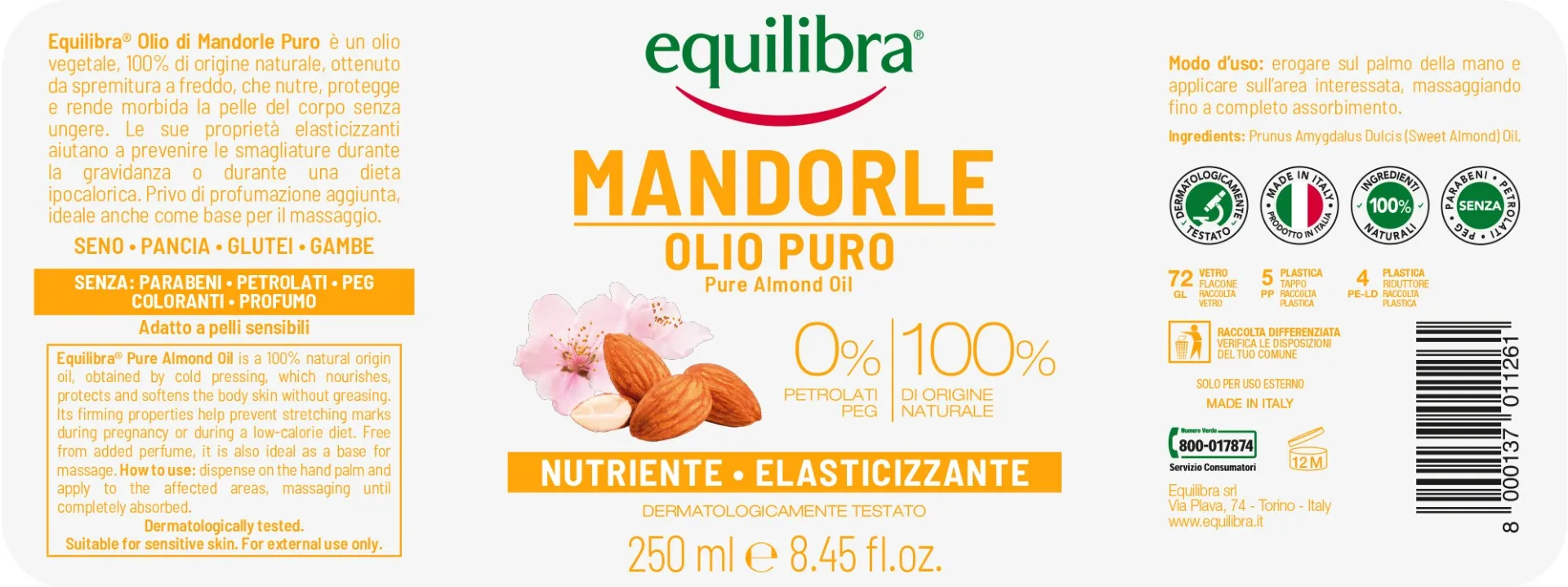 Миндальное масло Equilibra с эластичным и питательным действием, идеальное для тела.