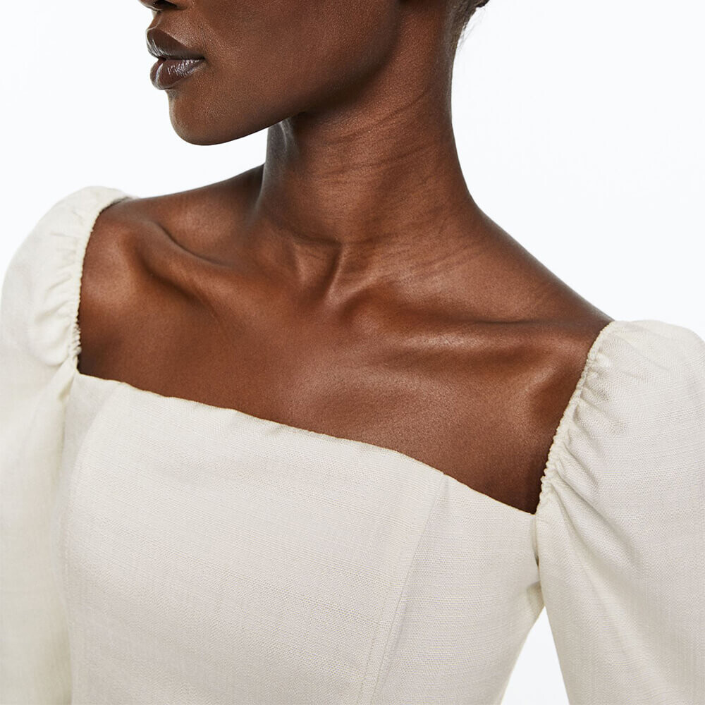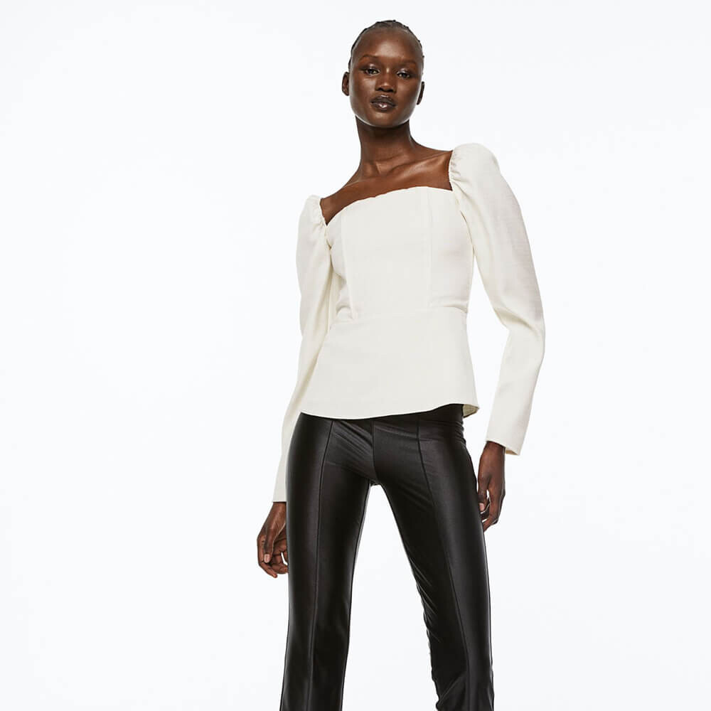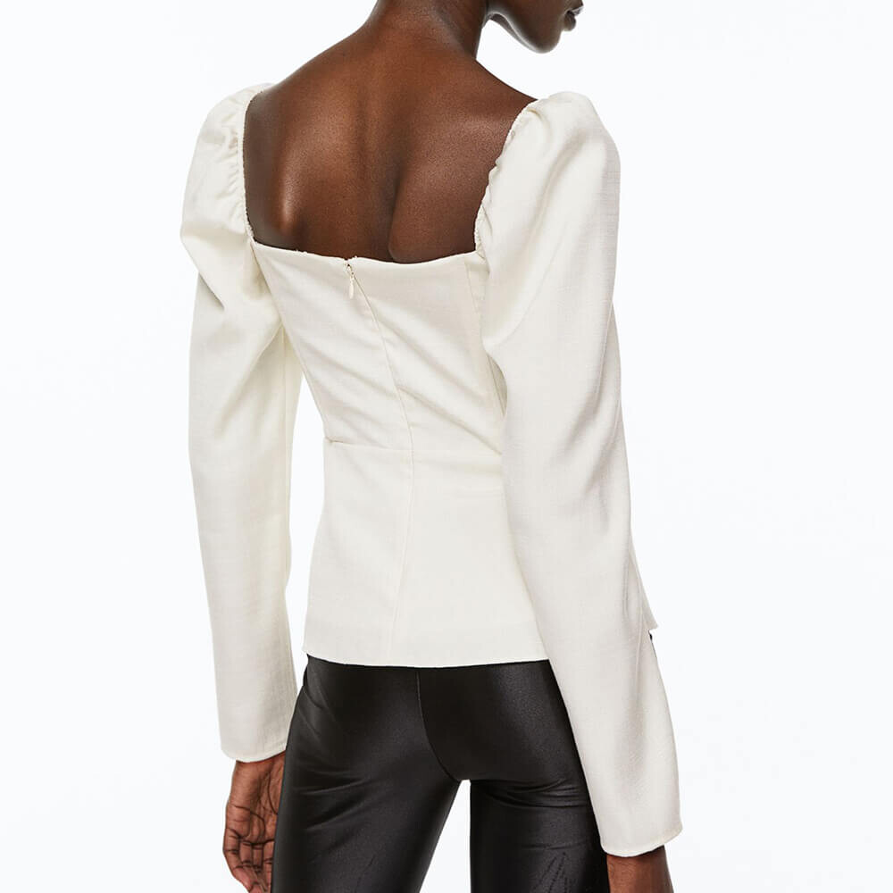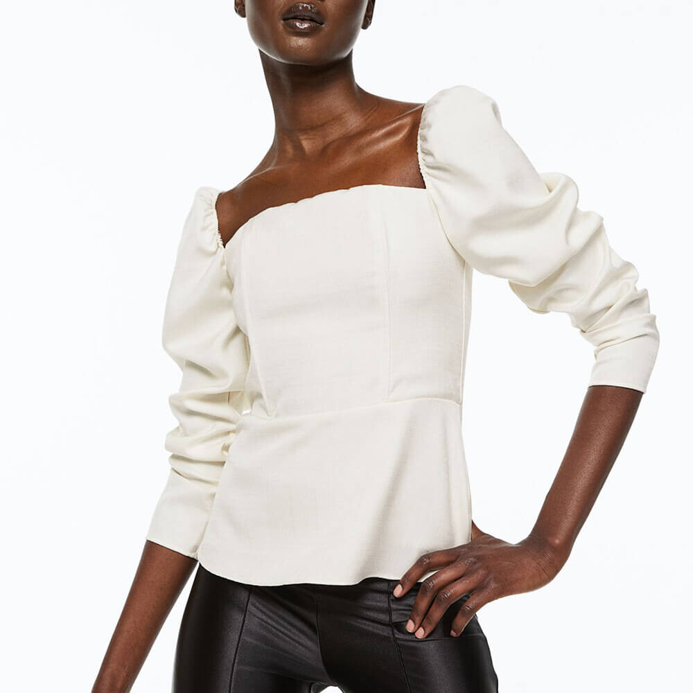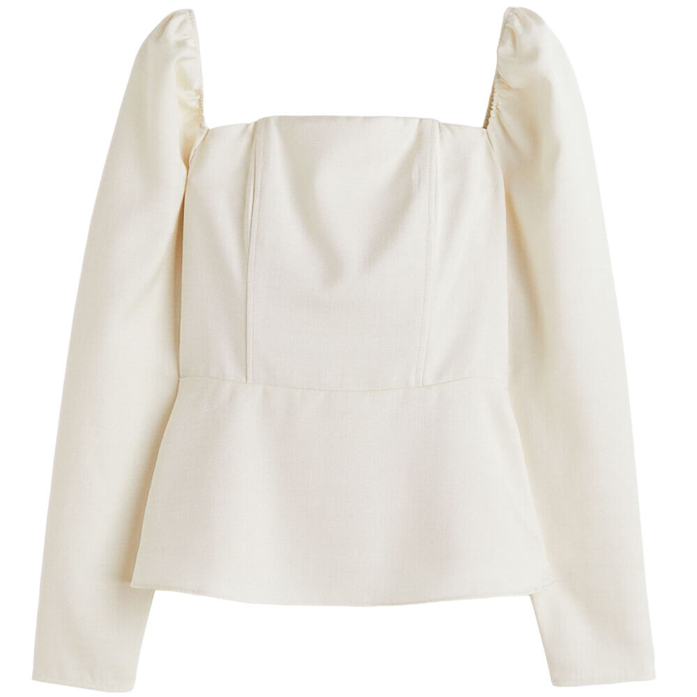 Блузка из ткани с облегающим верхом. Алмазный вырез горловины, длинные рукава-фонарики. Корсетные ребра жесткости спереди и потайная молния сзади. Отрез на талии и расклешенная кокетка. Частично на подкладке.