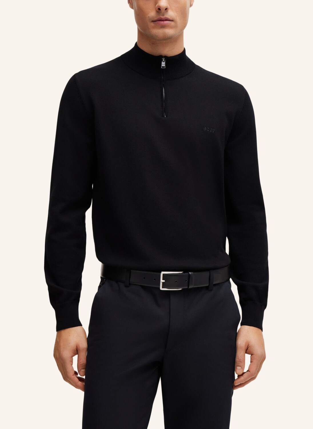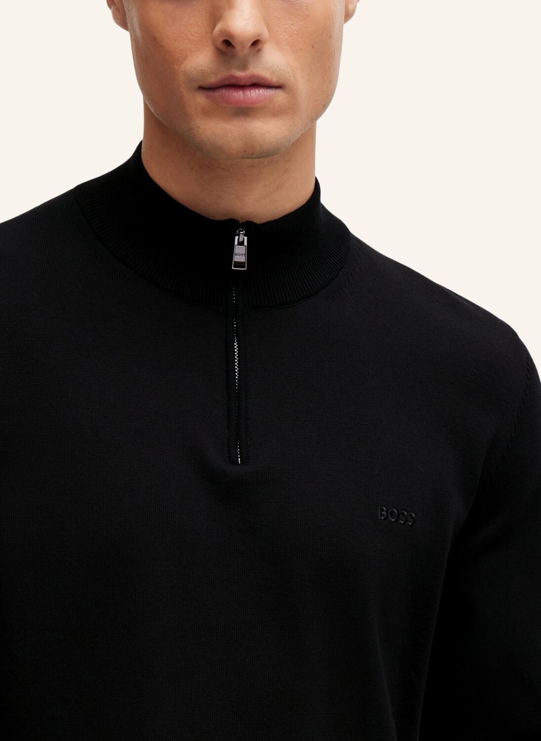 Элегантный свитер BOSS с молнией на воротнике. Модель связана из мягкой пряжи и украшена вышивкой логотипа BOSS на груди.