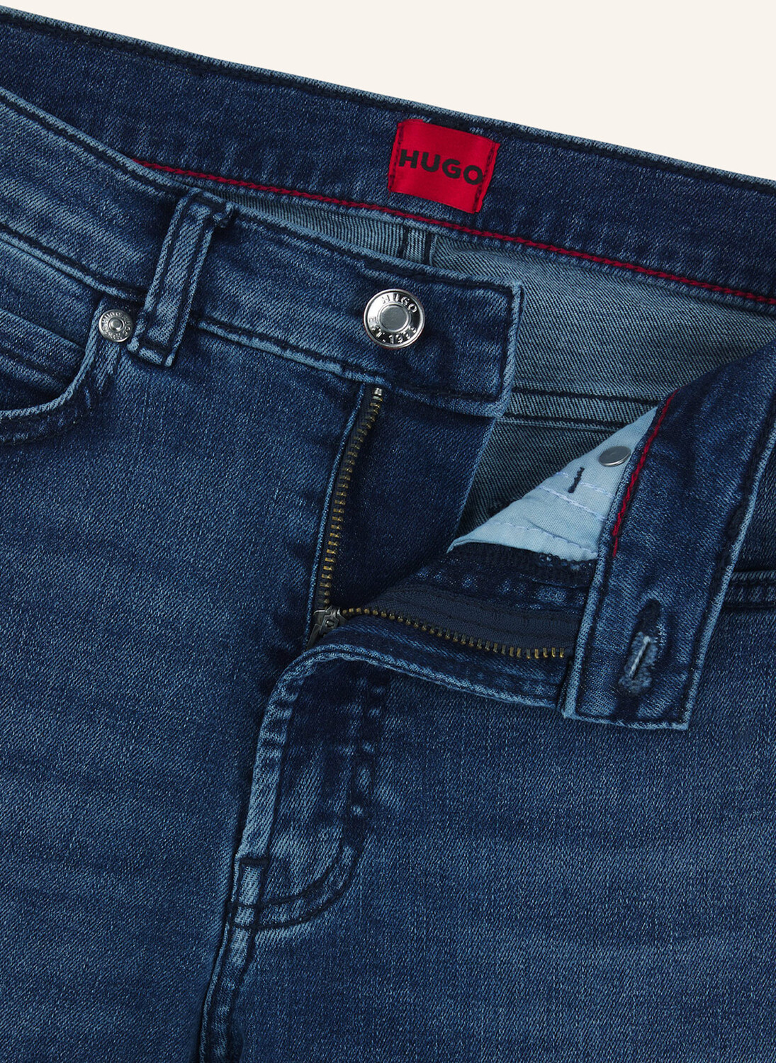 Универсальные джинсы HUGO с облегающими штанинами. Брюки изготовлены из суперэластичного денима, имеют среднюю посадку и аутентичную синюю расцветку.