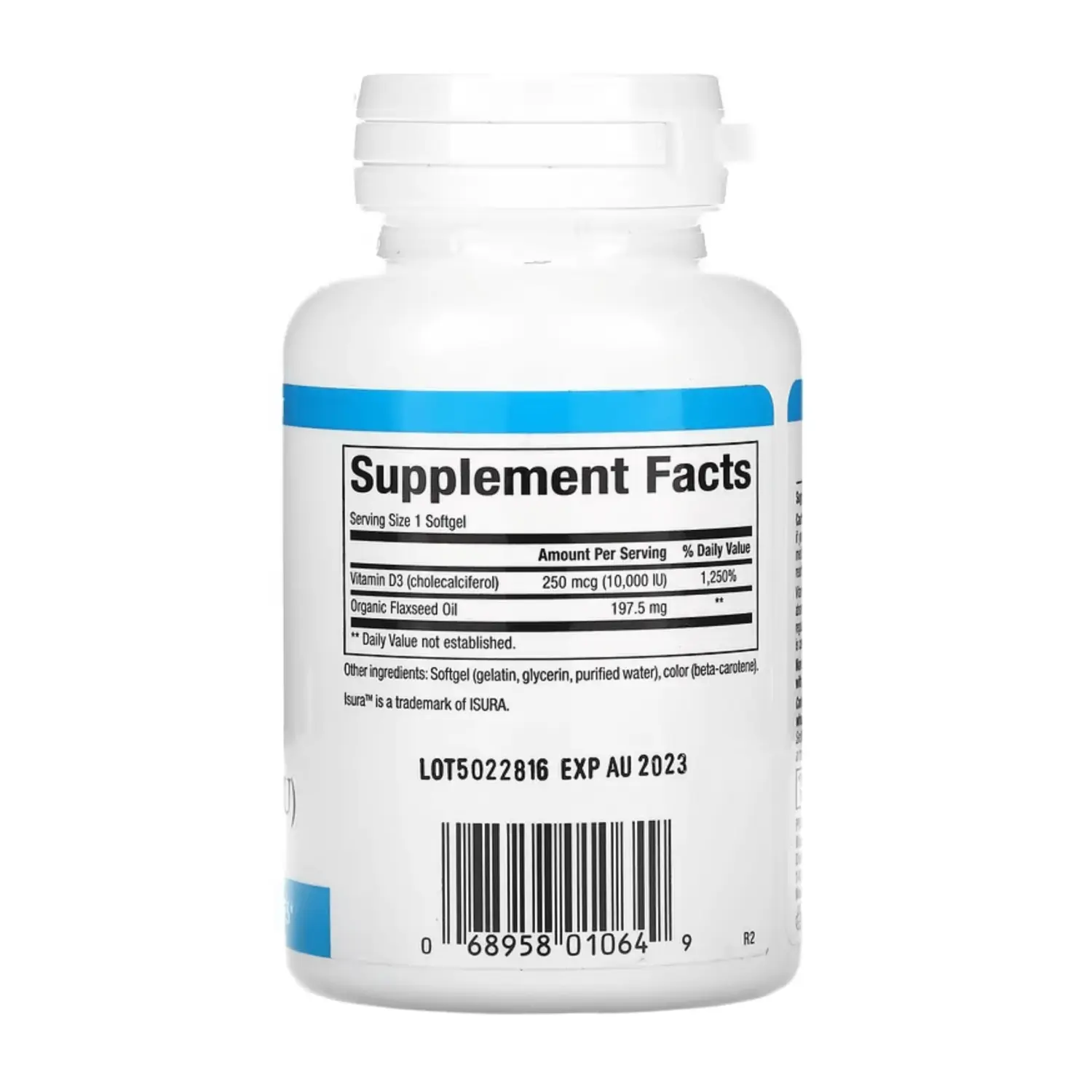 Поддерживает здоровые кости. Витамин D3 необходим для крепких костей и зубов, поскольку он увеличивает усвоение организмом кальция из пищи. Его роль в регулировании уровня кальция также помогает регулировать иммунную систему и поддерживать здоровье нервов и мышц. Витамин D3 тщательно смешан с органическим льняным маслом в удобной для проглатывания мягкой капсуле.