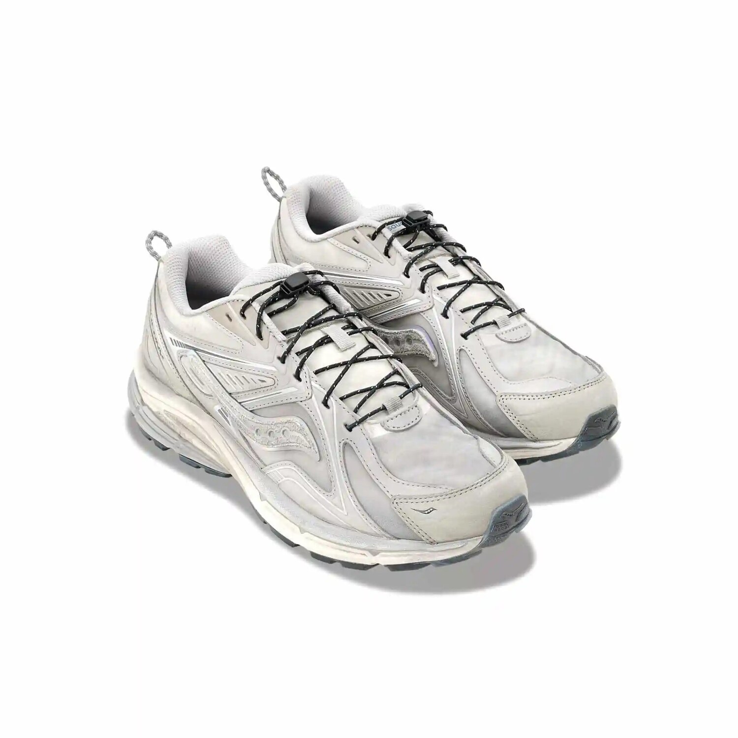 Эти версии предлагают красивый контраст цветов, вызывая в памяти межзвездный переход через черные, белые и серые тона, вдохновленные космическими образами. Потертая подошва и текстурированная перфорация привносят винтажный штрих, а знаковый логотип Saucony сбоку обтянут переливающимся материалом, напоминая о красоте Млечного Пути.