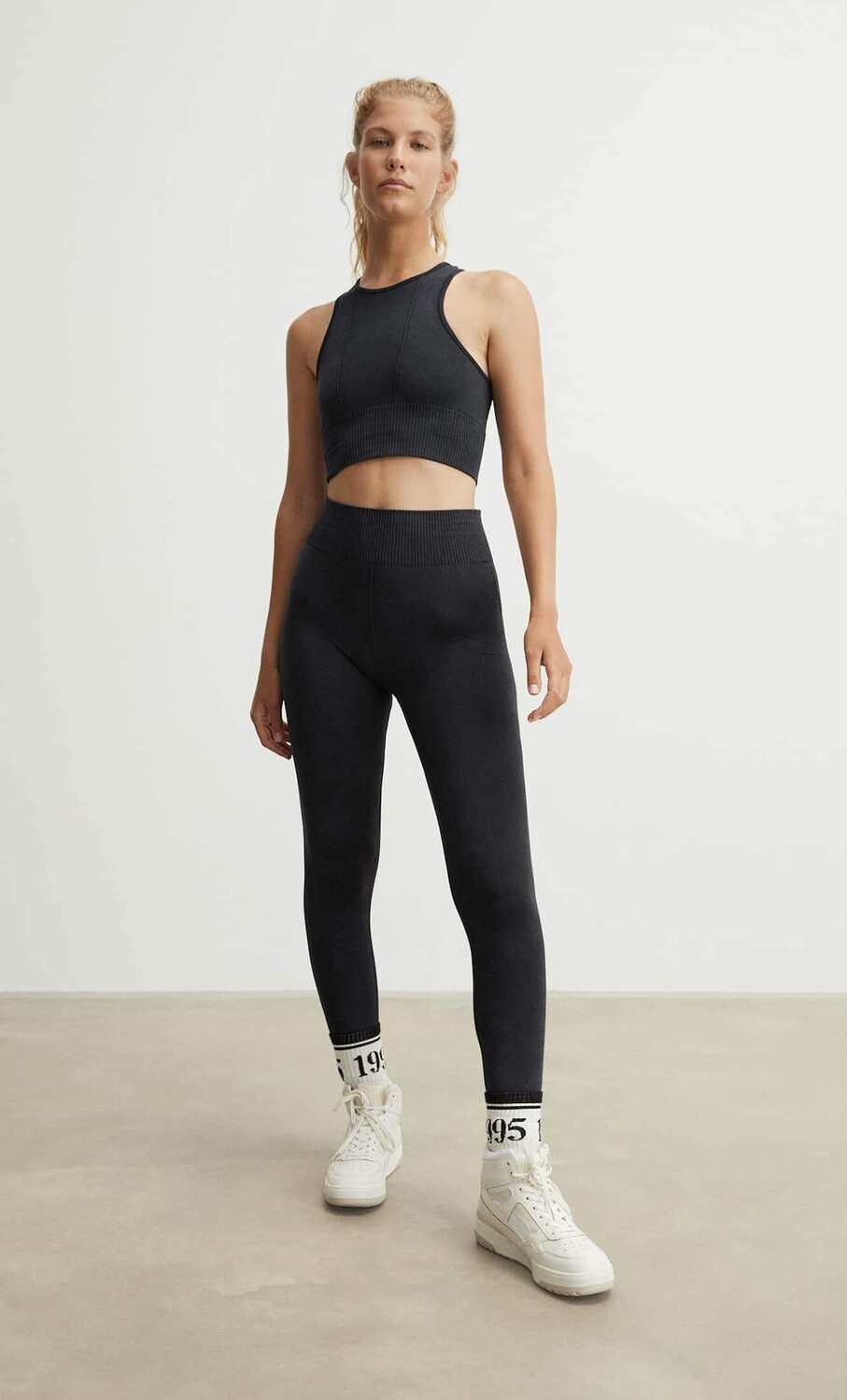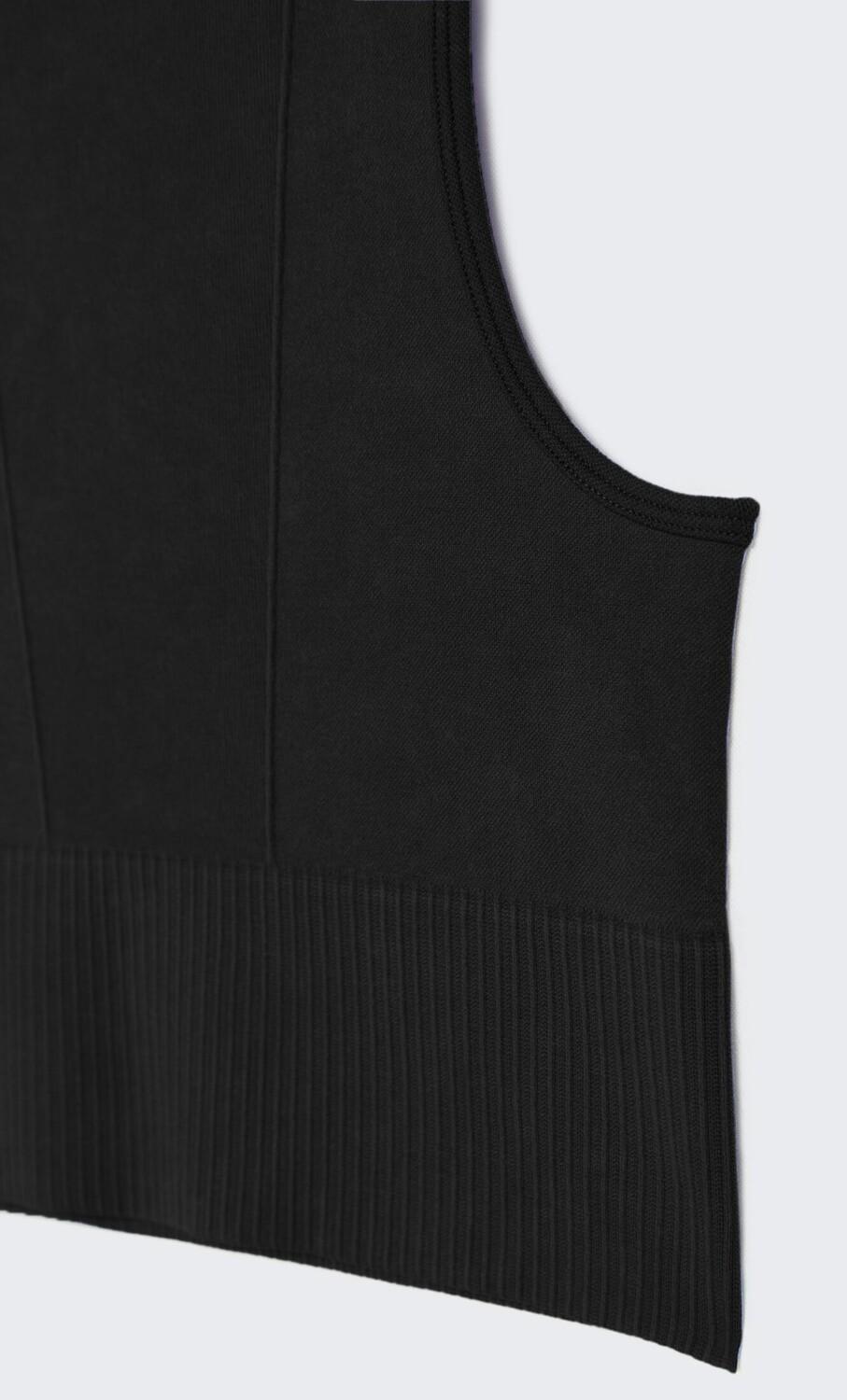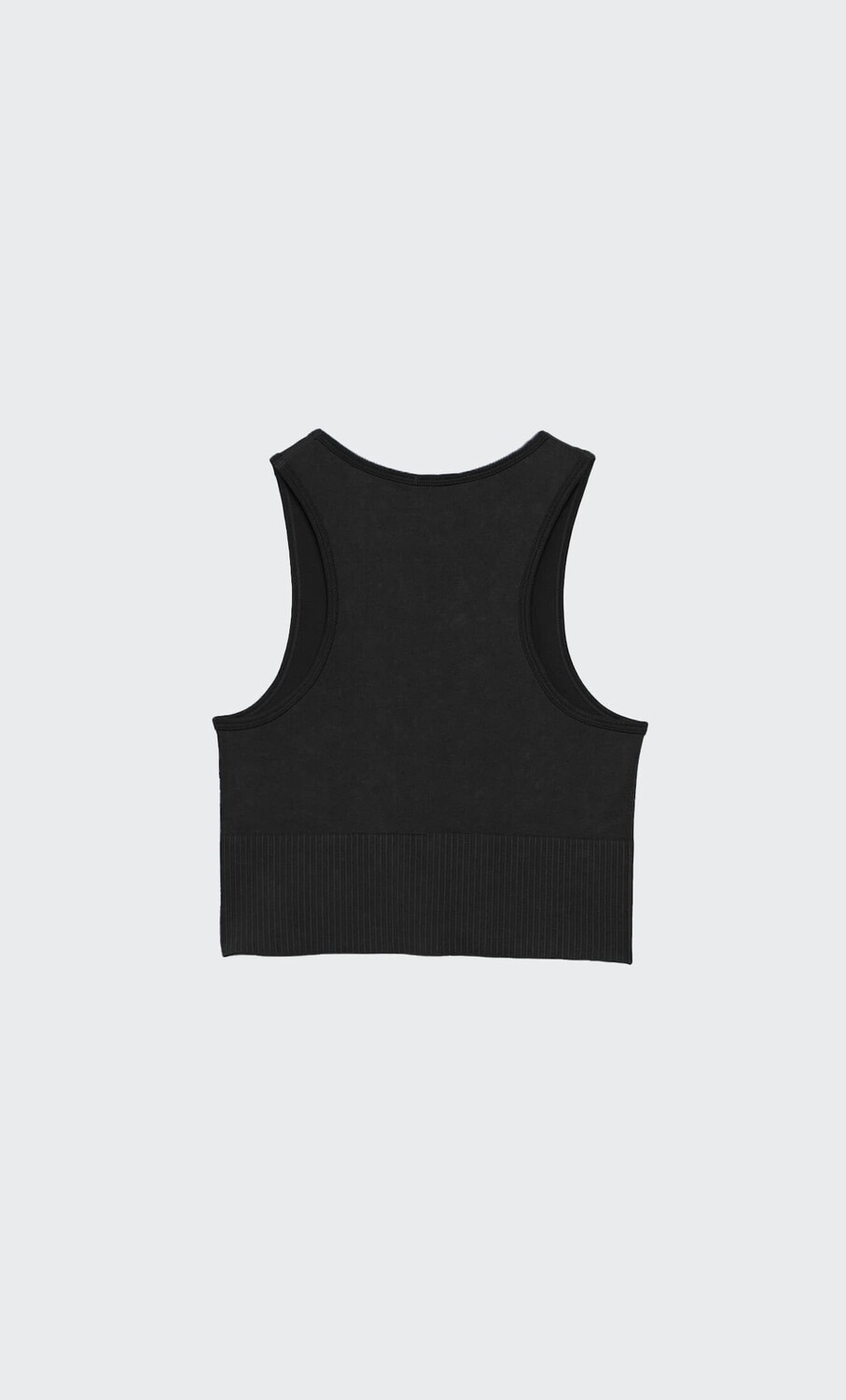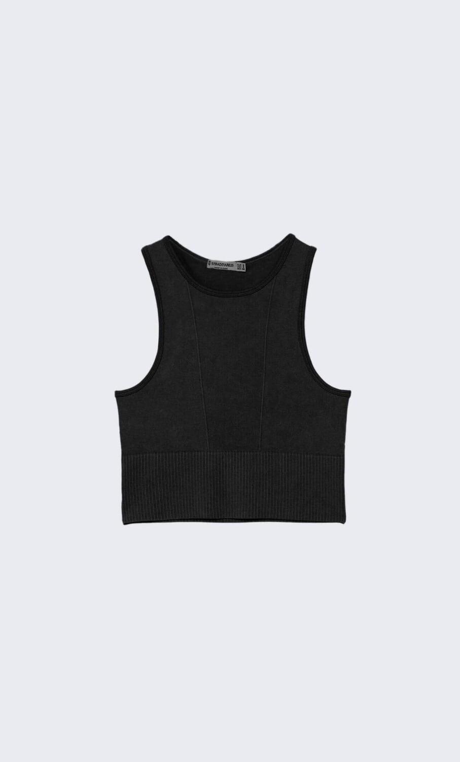 Бесшовный топ с широким поясом для лучшей посадки и V-образными швами спереди для усиления эффекта декольте. Изготовлен из ткани с минеральной стиркой для придания ей поношенного вида.