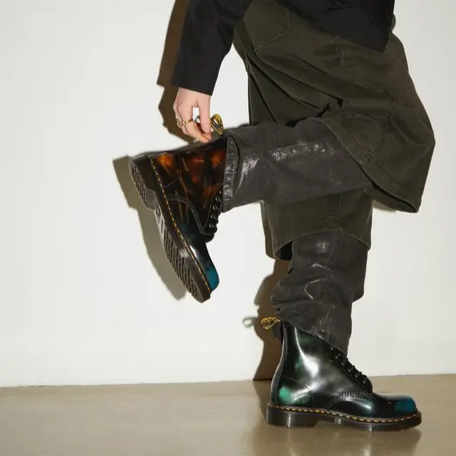Созданные на основе смелой цветовой палитры черного, желтого, зеленого и синего цветов, которые стареют и меняются по мере ношения, обновленные ботинки 1460 являются высшим символом самовыражения. Отделка из бронзы и классические шнурки наряду с нашими визитными карточками: желтая прострочка и петля AirWair на пятке.