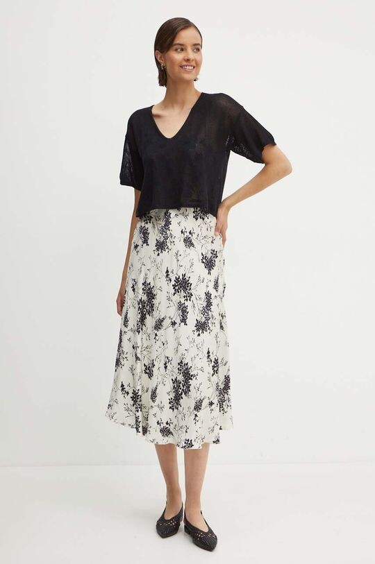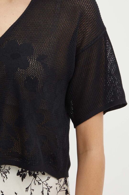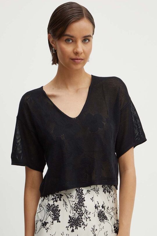 - Заостренный вырез. - Покрой рукава со спущенной линией плеча не ограничивает подвижность. - Свободный крой, обеспечивающий полную свободу движений. - Длина: 40 см. - Ширина под мышками: 50 см. - Размеры указаны для размера: S.