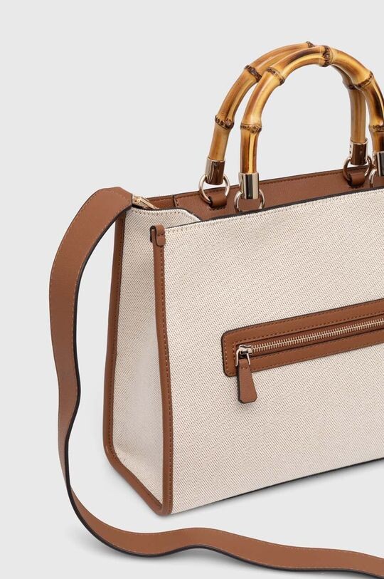 Сумочка среднего размера из коллекции Guess. Застегивающаяся модель из комбинации текстильного материала и экологической кожи.