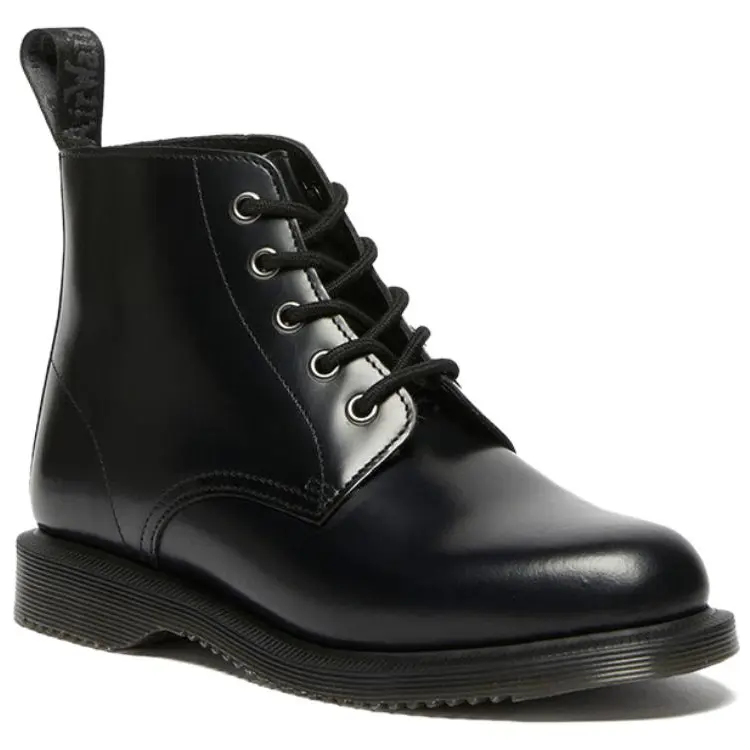 Модель Emmeline выполнена из прочной полированной кожиPolished Smooth, характерной для оригинальных материалов Dr. Martens. Верх изготовлен из гладкой, блестящей кожи, подчеркивающей минималистичный дизайн. Ботинки оснащены пятью серебристыми люверсами, низкопрофильной рифленой подошвой и простым рантом, обеспечивающим аккуратную отделку.