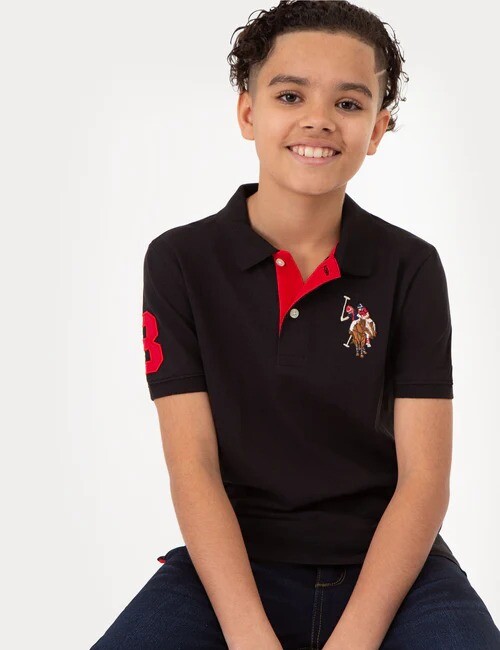 Футболка поло для мальчиков с многоцветным логотипом U.S. Polo Assn. — это вневременный предмет гардероба. Модель украшена воротником с контрастной передней планкой на двух пуговицах, большим разноцветным вышитым логотипом вдоль верхней левой части груди и короткими рукавами с манжетами из резинки. Футболка украшена аппликацией в виде цифры три на правом рукаве и отделана разрезами по подолу с контрастной тесьмой. Изделие выполнено в классическом стиле рубашки поло и имеет свободный силуэт для удобной посадки.
