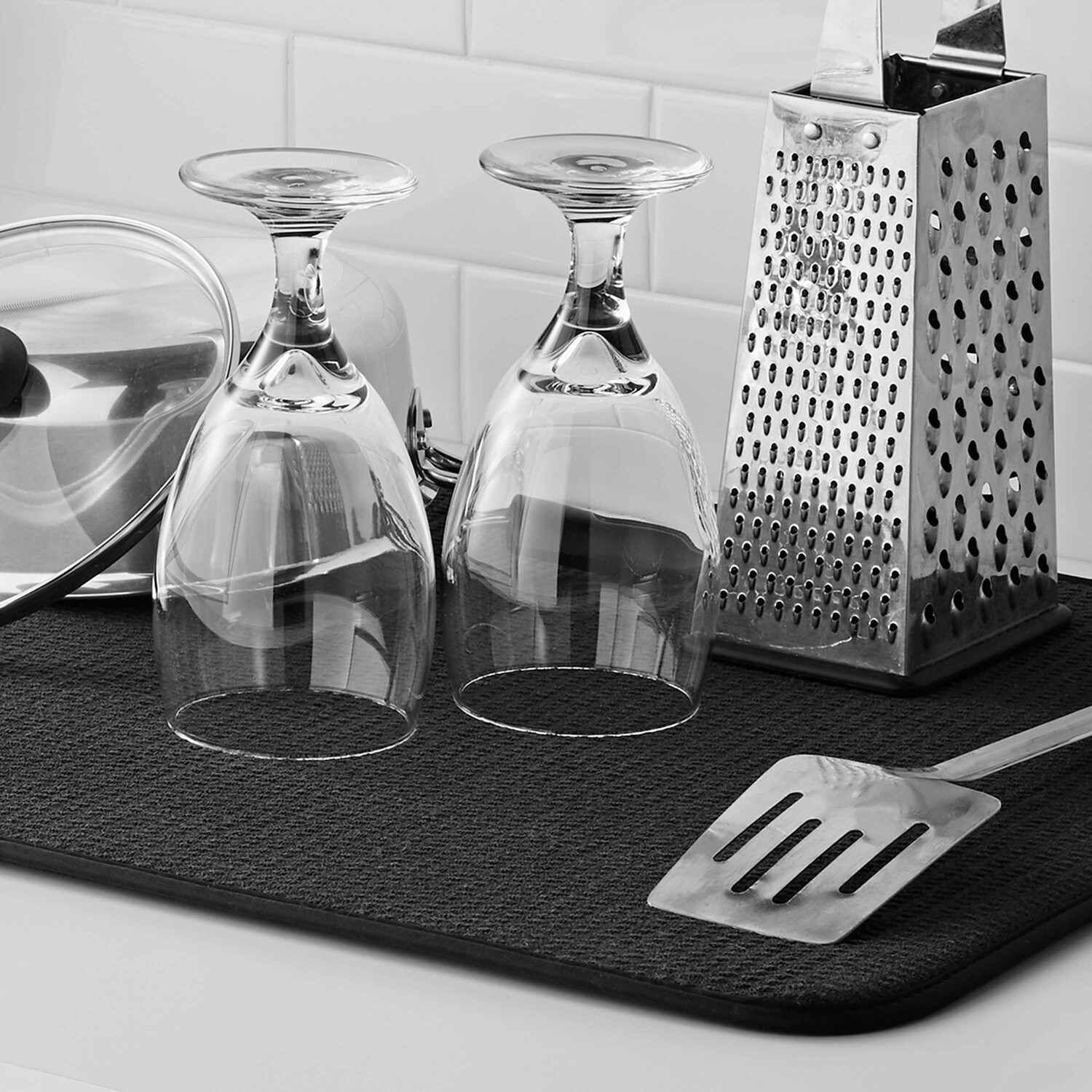 Коврик для сушки посуды Mainstays — это решение давней традиции класть кухонные полотенца на стойку во время мытья кастрюль, сковородок, посуды и стеклянной посуды вручную. Уникальный ламинированный дизайн сочетает в себе толстый слой пены между слоем супервпитывающей микрофибры и слоем сетки. Быстросохнущий сетчатый слой вентилирует поток воздуха вокруг посуды с помощью аэрационных каналов, что помогает избежать запотевания и образования конденсата.