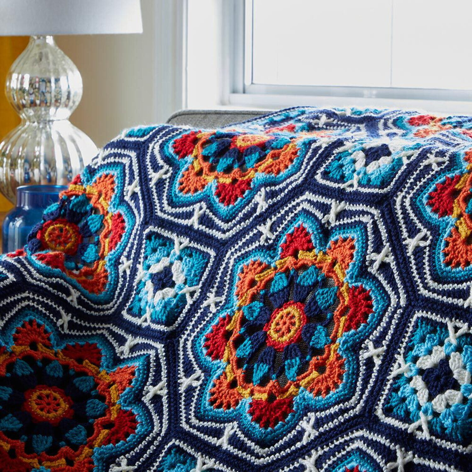 Потрясающее отображение цветов, образованное объединением мотивов, напоминает прекрасно детализированные персидские мозаичные плитки, существующие тысячи лет. Разработан Джейн Кроуфут. В комплект входит пряжа Premier Everyday DK, схема и инструкция. Готовый размер 46,5 дюймов (118,11 см) x 46,5 дюймов (118,11 см). Необходимы крючки Е-4 (3,5 мм), G-6 (4 мм) и №7 (4,5 мм).