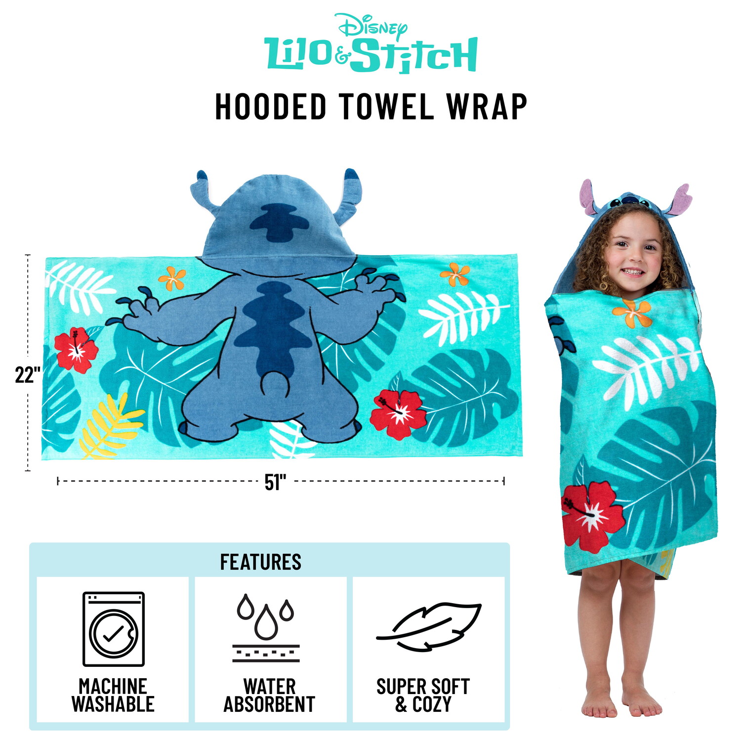 Вашему малышу понравится завернуться в это полотенце для ванной с капюшоном Stitch Kids. Это полотенце с капюшоном, изготовленное из 100% хлопка, очень впитывает влагу и будет очень мягким для кожи вашего ребенка. Для легкой и удобной очистки: Машинная стирка в холодной воде, сушка в стиральной машине при низкой температуре. Это полотенце с капюшоном размером 51 х 22 дюйма идеально подойдет вашему малышу, независимо от того, находится ли он на пляже или просто выходит из ванны! Это полотенце с капюшоном, выполненное в дизайне Stitch, поможет им всегда вытереться.