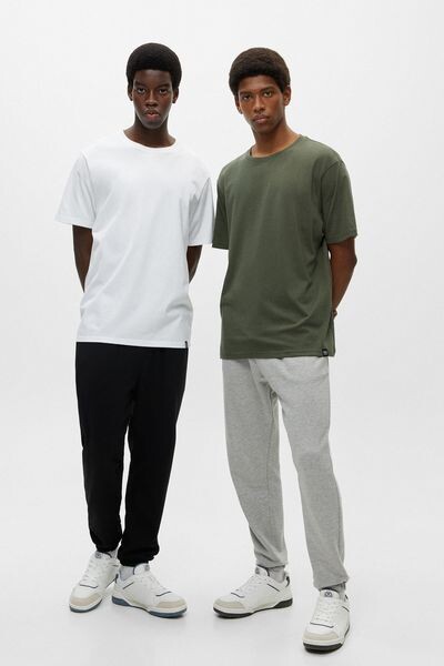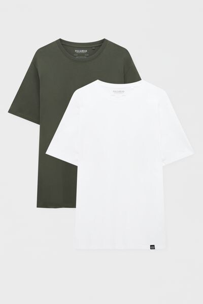 Набор из двух основных футболок разных цветов, с короткими рукавами, круглым вырезом горловины, из 100% хлопка.