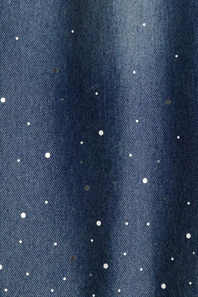 Брюки из плотного трикотажа, напоминающие джинсовую ткань. Пояс с регулируемой резинкой, ложной ширинкой, ложными передними карманами и широкими штанинами.