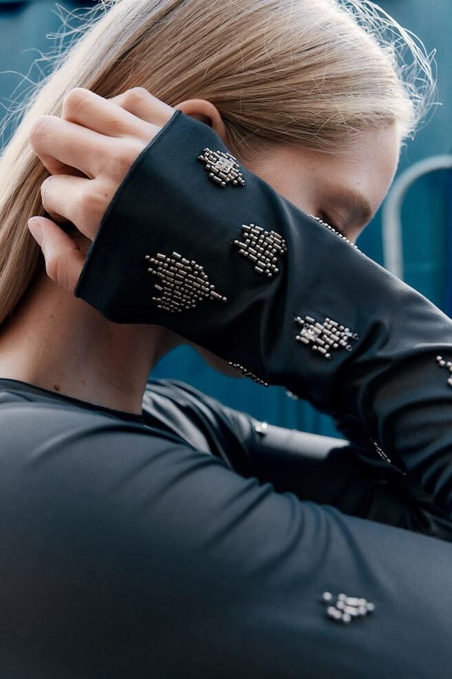 Приталенная рубашка из эластичного трикотажа с декоративным узором по всей поверхности из мелкого стекляруса. С круглым вырезом, длинными рукавами и оверлоком по краям.