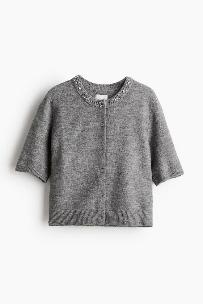 Короткий кардиган из мягкого трикотажа с круглым вырезом, декорированным стразами, планкой на пуговицах и короткими рукавами. Ребристые манжеты на вырезе, рукавах и подоле.