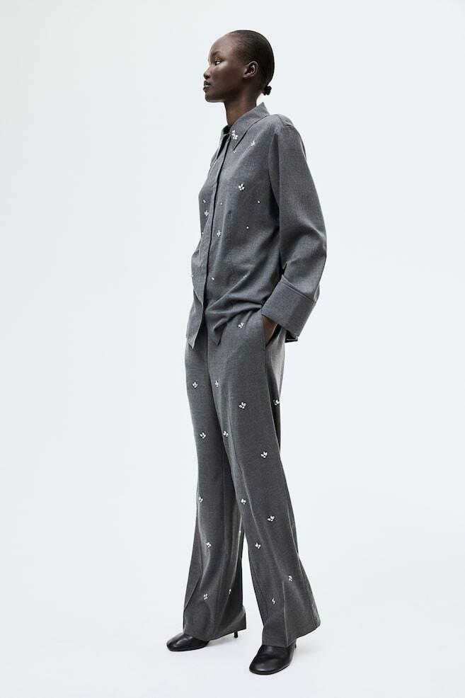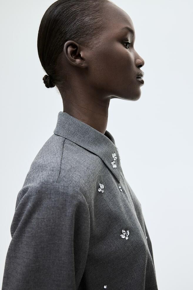 Рубашка из тканого материала, украшенная спереди сверкающими стразами. Воротник, потайные пуговицы спереди, формирующие швы для зауженной талии и длинные рукава с широкими подвернутыми манжетами на пуговице.