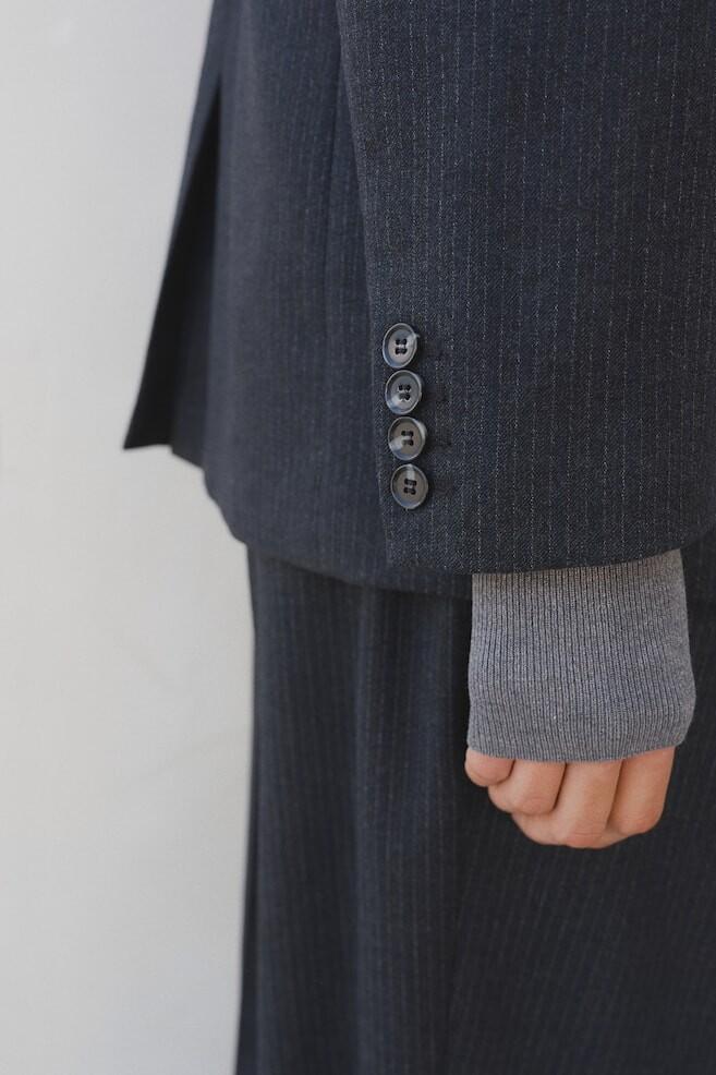 Двубортный тканевый пиджак с остроконечными лацканами. Тонкие подплечники, декоративные пуговицы на рукавах, прорезной карман на груди и окантовочные передние карманы с клапанами. Разрез сзади. Фед.