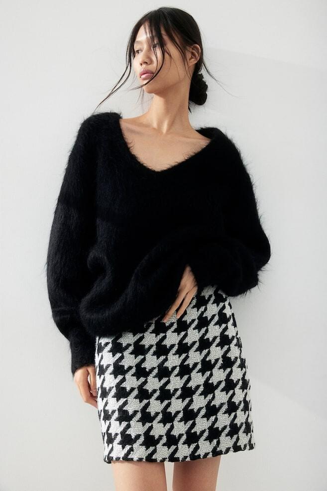 Короткая, облегающая фигуру юбка из тканого материала предложенного А-силуэта, с высоким поясом на потайной резинке и потайной застежкой-молнией и пуговицей. Фед.