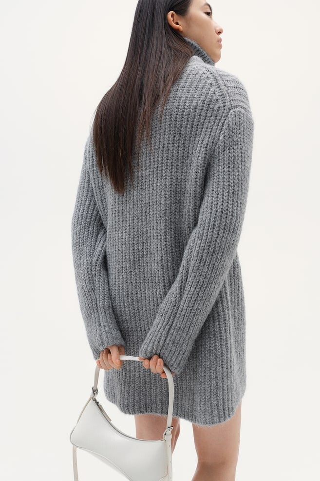 Короткое платье из мягкого рубчатого трикотажа с водолазкой, короткой застежкой-молнией, сильно заниженной линией плеч и длинными рукавами. Узкий ребристый воротник и манжеты, прямой подол.
