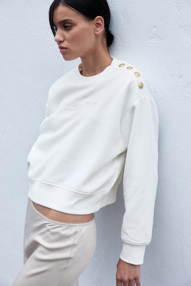 Чуть укороченная толстовка с мягким начесом внутри. Свободная посадка. С золотыми пуговицами на одном плече и сильно заниженным плечом. Ребристые манжеты на вырезе, рукавах и подоле.