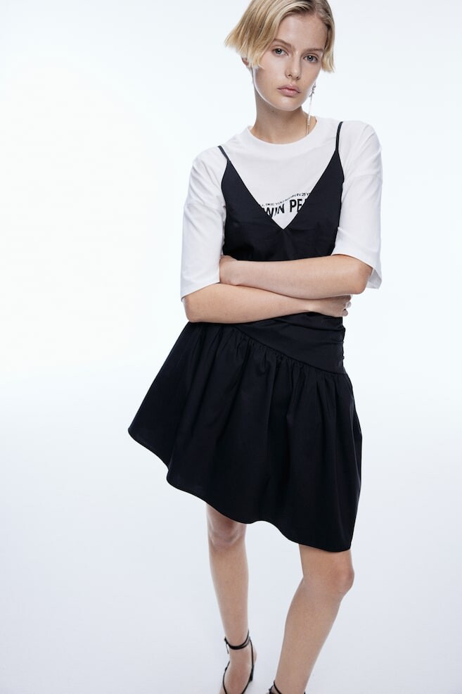 Короткое тканевое платье с V-образным вырезом, узкими регулируемыми бретелями и потайной боковой молнией. Двухслойный топ с эффектом присборенности по боковым швам. Диагональный шов над бедрами, слегка расклешенная юбка с подкладкой из тюля и асимметричный низ с мотивной вышивкой с одной стороны.