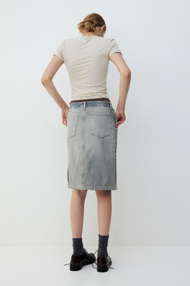 Юбка длиной до колена с пятью карманами, нормальным поясом, ширинкой на молнии и пуговице. Высокий разрез на штанинах спереди.