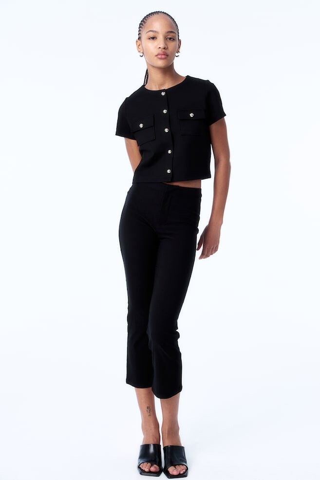 Короткий топ из вафельного трикотажа с круглым вырезом, короткими рукавами и пуговицами спереди. Накладные нагрудные карманы с клапаном и пуговицей, прямой низ.