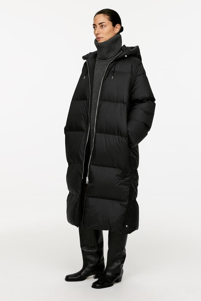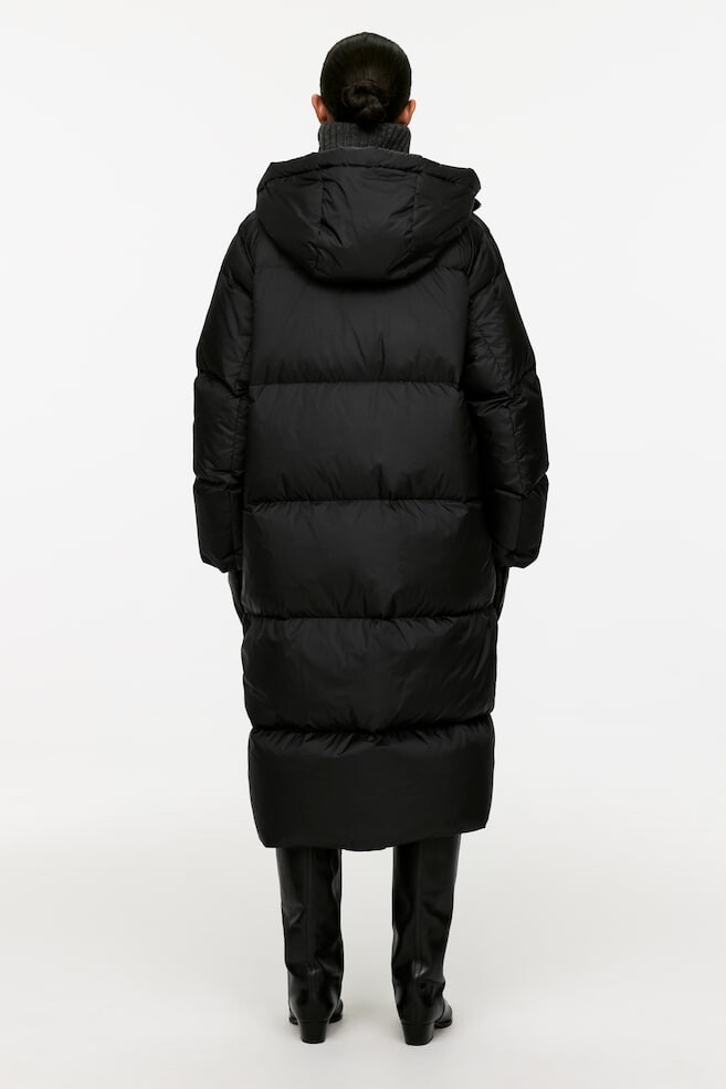 Длинное пуховое пальто с наполнителем из пуха и пера. Модель с капюшоном, застежкой-молнией спереди и потайными боковыми разрезами на кнопках. Боковые карманы на молнии.