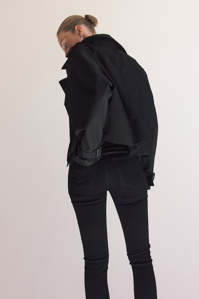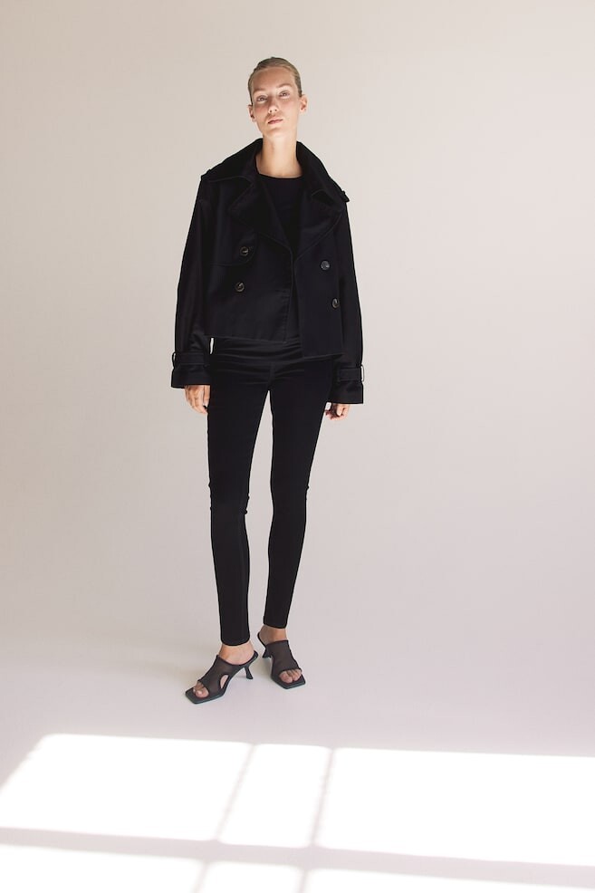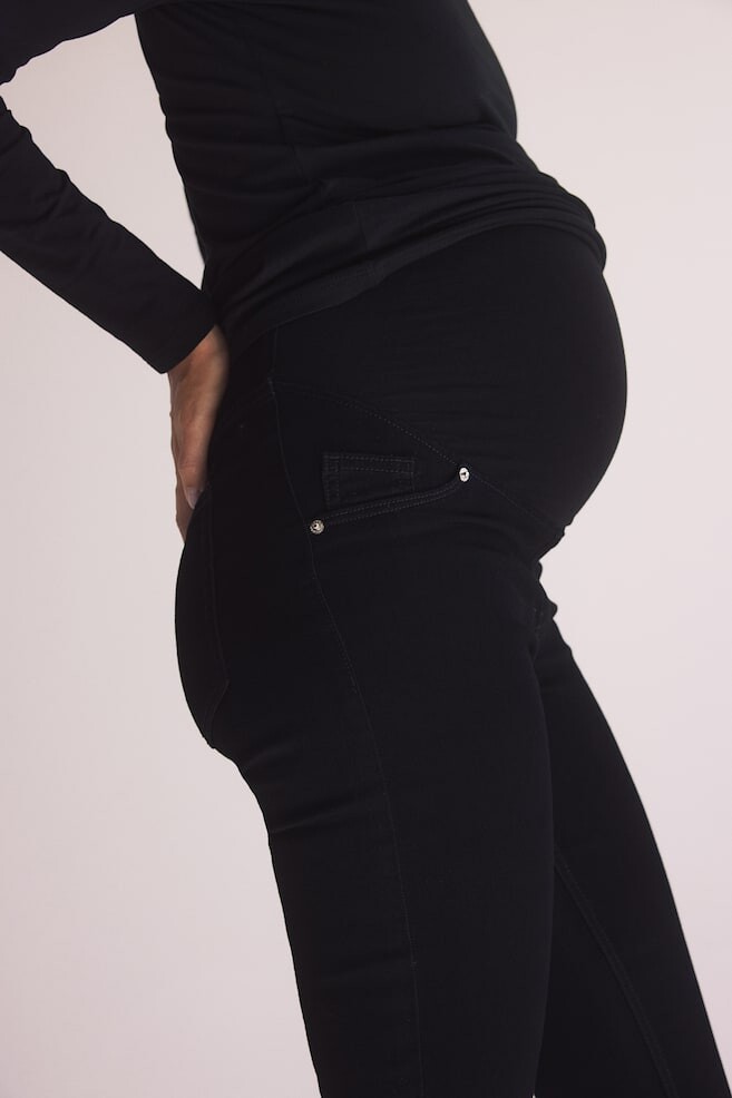 Джинсы из эластичного денима с облегающим кроем от пояса до манжет на штанинах. Накладные передние карманы, настоящие задние карманы и ложная ширинка. Широкий трикотажный пояс обеспечивает оптимальную посадку на животе.