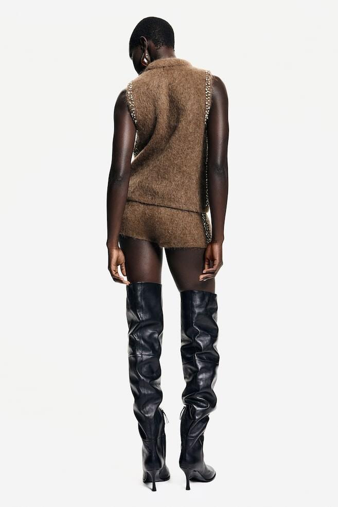 Мини-Шортички из мягкого трикотажа с добавлением мохера и шерсти. Эластичный пояс в рубчик и сверкающие стеклянные стразы по бокам.