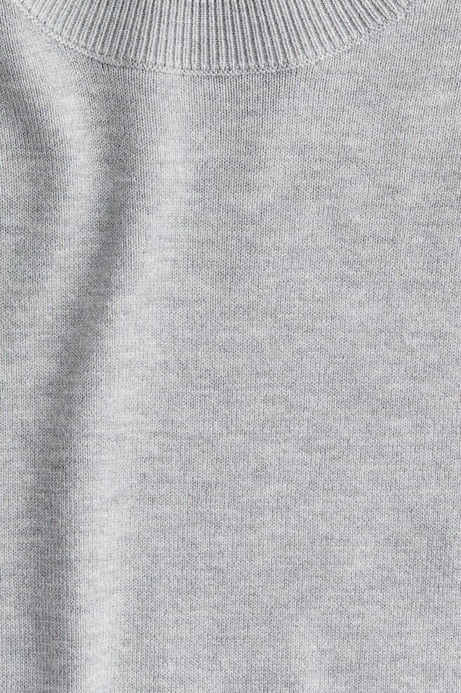 Пуловер из мягкого тонкого трикотажа с круглым вырезом в рубчик, заниженной линией плеч и длинными, слегка объемными рукавами. Ребристые манжеты и нижний край.