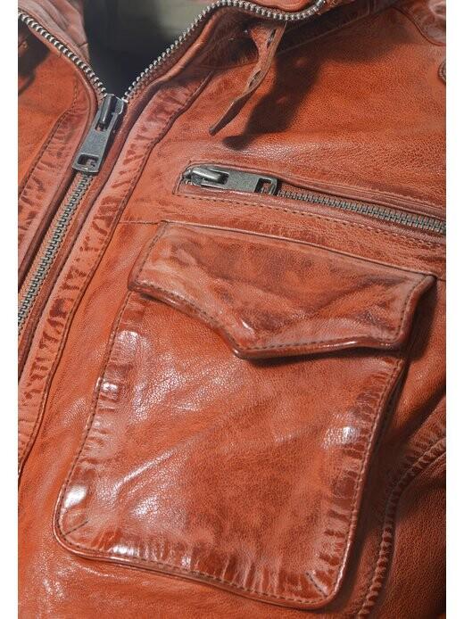 Красивая кожаная куртка от JCC. Куртка застегивается на прямую молнию до воротника рубашки, которая фиксируется трехсторонней регулируемой пряжкой. Имеет два внутренних кармана, один из которых на небольшой молнии, а другой на пуговице. Прямой крой и молния на манжетах обеспечивают удобство ношения. Прямой крой Регулируемая пряжка на воротнике рубашки Прямая молния Три нагрудных кармана, два из них на кнопках Два внутренних кармана: один на молнии, другой на кнопке.