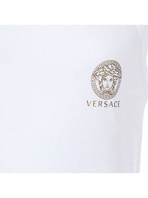 Качественные мужские майки с круглым вырезом от бренда VERSACE. Эластичный хлопковый трикотаж высокого качества, с золотым логотипом VERSACE/принтом Medusa.