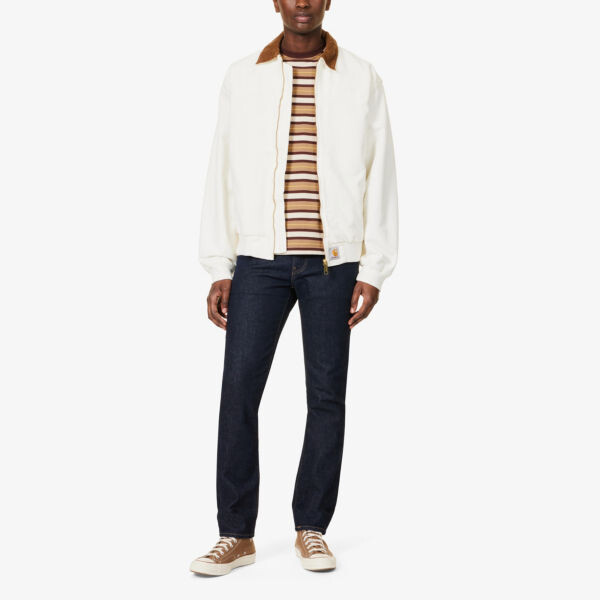Облегающий крой, средняя посадка, прямые штанины, шлевки для ремня, пять карманов, фирменная нашивка и ярлычок сзади, прямые манжеты