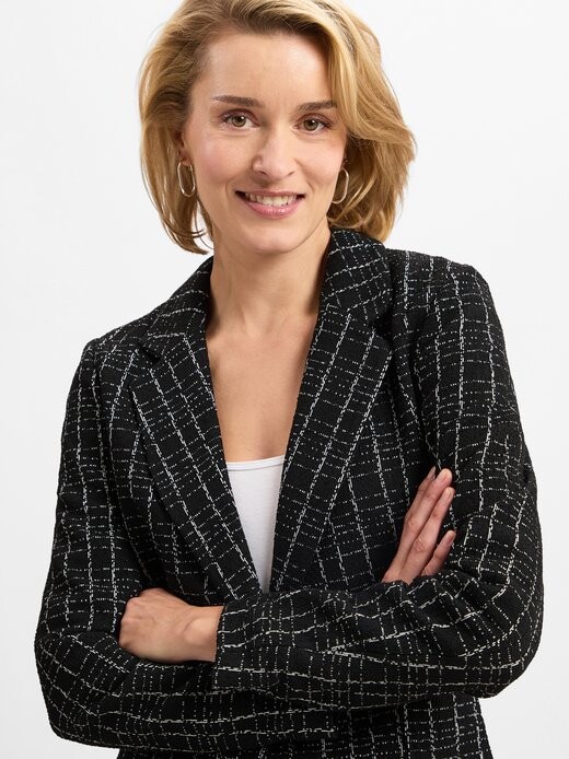 Слегка вкрапленные блестящие нити подчеркивают структурированный вид пиджака-запятой и делают его идеальным выбором для особых случаев и вечерних мероприятий.