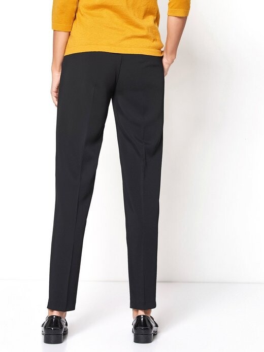Брюки нормальной длины характеризуются завышенной талией и удобной частичной резинкой. Узкая ширина бедра и прямая брючина гарантируют идеальную посадку. Спереди есть прорезные карманы, сзади карманов нет. Устойчив к морщинам, прост в уходе и эластичен. На нашей модели Almuth размер 36, рост 177 см. Заглаженные складки Боковая резинка для максимального комфорта Не мнется.