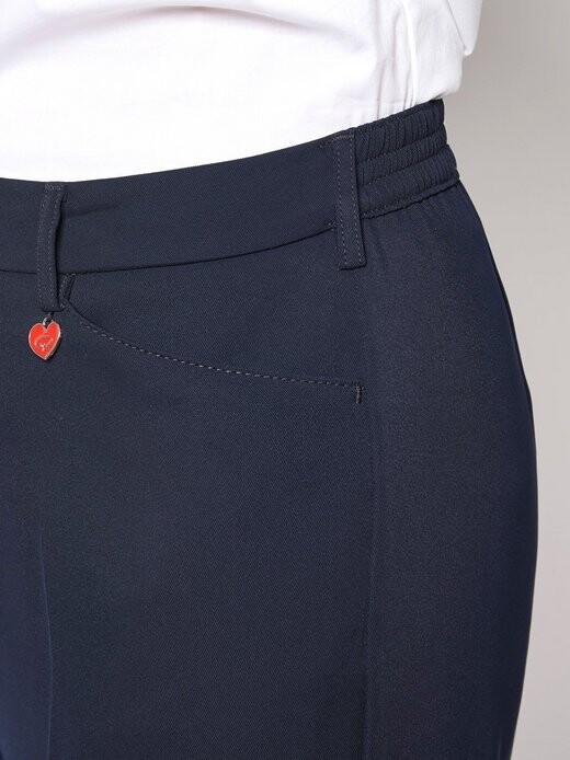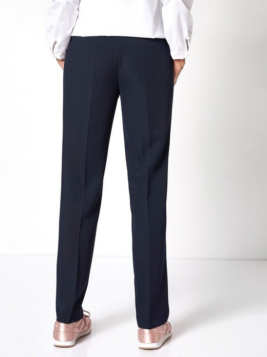 Брюки нормальной длины характеризуются завышенной талией и удобной частичной резинкой. Узкая ширина бедра и прямая брючина гарантируют идеальную посадку. Спереди есть прорезные карманы, сзади карманов нет. Устойчив к морщинам, прост в уходе и эластичен. На нашей модели Almuth размер 36, рост 177 см. Заглаженные складки Боковая резинка для максимального комфорта Не мнется.