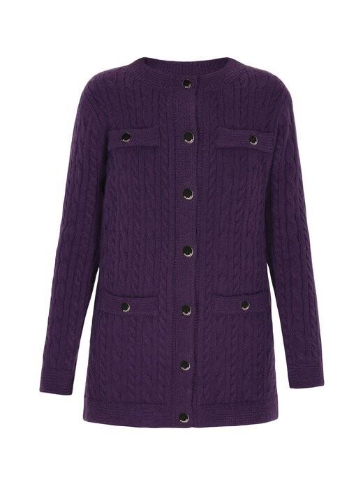 Побалуйте себя роскошным комфортом и вневременным стилем этого элегантного кардигана. Благодаря своей ребристой структуре и рисунку кабелей он излучает чистую изысканность. Округлый вырез и планка на пуговицах придают модели элегантный вид, а карманы, украшенные металлическими украшениями, придают модели гламурный вид. Этот кардиган средней длины с ребристыми манжетами и нижним краем обеспечивает удобную посадку и идеально добавит тепла и стиля любому наряду. Рубчатая текстура и косая вязка Круглый вырез и планка на пуговицах Карманы с металлическими украшениями Рубчатые манжеты и подол