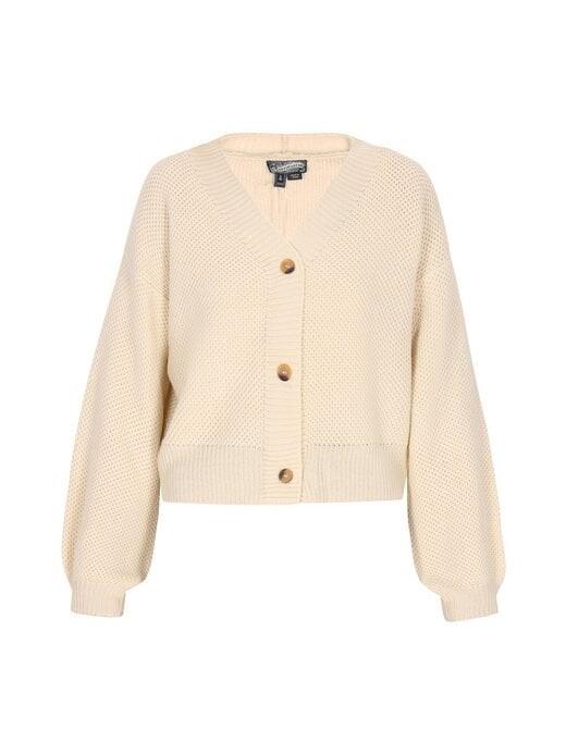 Этот кардиган, созданный с особым вниманием к деталям, впечатляет коротким силуэтом и очаровательным V-образным вырезом. Центральная планка украшена рядом стильных пуговиц, а длинные рукава с тонкими буфами на плечах придают объем. Узор тонкой вязки придает изделию равномерную текстуру и дополняется двумя практичными передними карманами возле подола. Укороченный силуэт V-образный вырез Рукава-фонарики Передние карманы