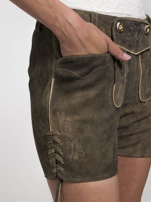 Женские кожаные брюки от Spieth and Wensky впечатляют элегантной шнуровкой на манжетах ног и изысканной вышивкой. Изготовленные из козьей замши на подкладке, они обеспечивают длительный комфорт благодаря длине брюк 28 см. Идеально подходит для стильных традиционных нарядов с оттенком изысканности. Короткие кожаные брюки 28 см Завязки на манжетах Молния на нагруднике Детальная вышивка Удобная козья замша