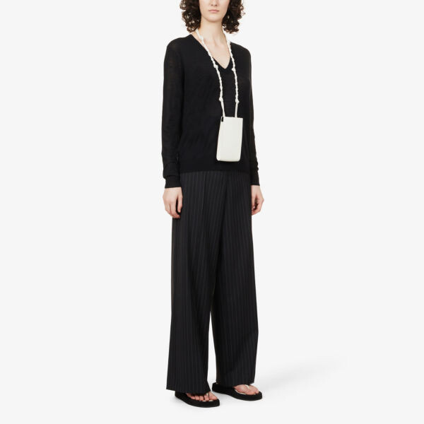 Классический крой, глубокий V-образный вырез, длинные рукава, полупрозрачная ткань, тонкая вязка, отделка в рубчик