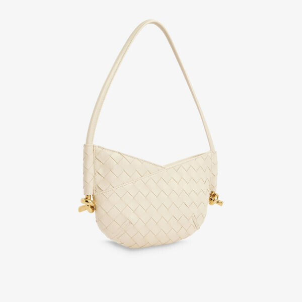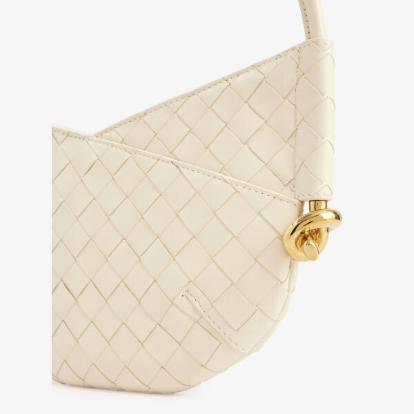 Изогнутая форма, верхняя ручка, бляшка с узором в виде узла сбоку, двустороннее плетение по всей поверхности, гладкая кожа по всей поверхности, золотистая фурнитура, одно основное отделение, полностью на подкладке
