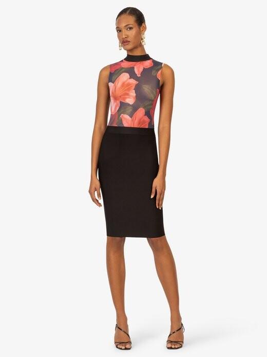 Это платье без рукавов с узором, высоким воротником и облегающим кроем. Геометрический узор придает платью современный вид, а длина до колен придает элегантный вид. Идеально подходит для вечеринок и стильных вечеров.