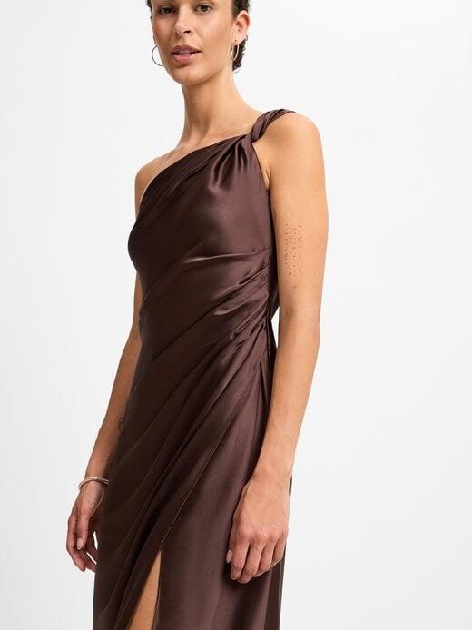 Стильный дизайн на одно плечо с драпировкой создает элегантную динамику и делает вечернее платье Marie Lund элегантным и игривым.