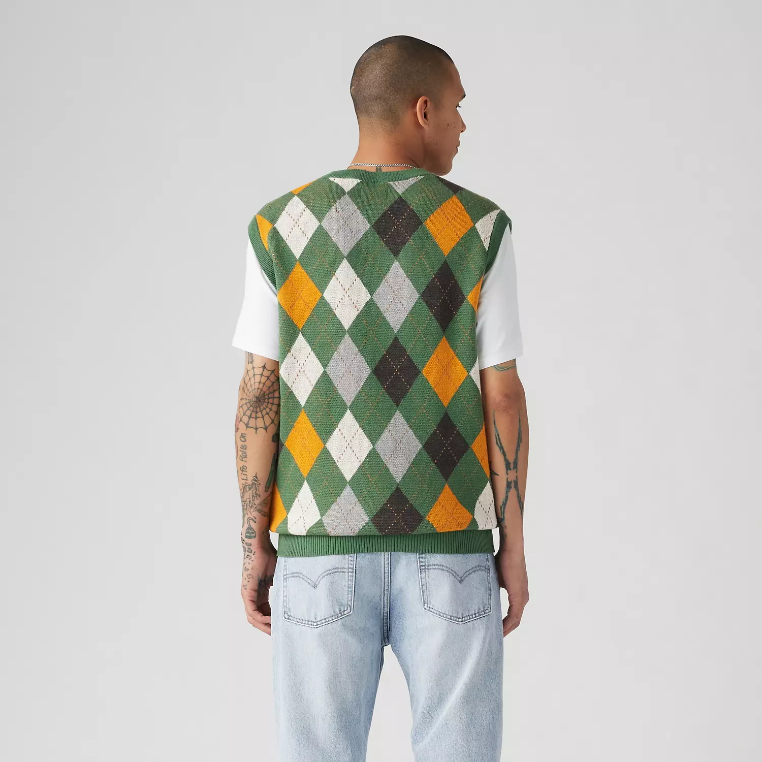 Жилеты-свитера никуда не денутся. Доказательство этому: наш жилет-свитер Skyline. Мы придали ему V-образный вырез, стандартную посадку и принт с ромбами в стиле ретро.