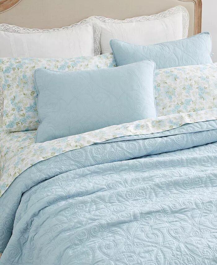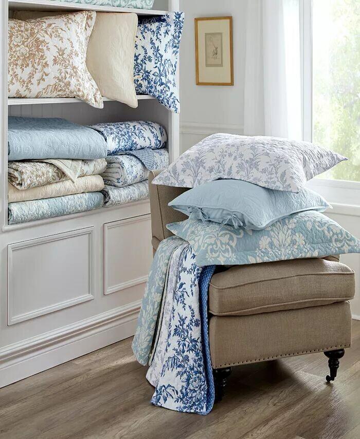 Лаура Эшли предлагает фирменные цвета для создания однотонной основы для спальни. Комплекты одеял и кушеток Felicity, предлагаемые в синем и светло-зеленом цветах, станут универсальным дополнением к декору любой спальни. Сложный стежок для завитков навеян классическими решетчатыми узорами железной конструкции и придает дополнительный объем за счет интерпретации дизайна двойной иглой. Застежки, связанные вручную, добавляют декоративных деталей.