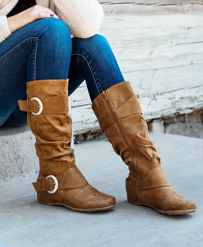 Окунитесь в модный стиль с ботинками с плоскими пряжками от Journee Collection. Эти обязательные высокие ботинки имеют верх из гладкой искусственной замши (полиэстера, полиуретана) с широкими икрами и изящным стилем с напуском, поднимающимся до середины икры.