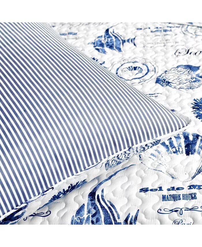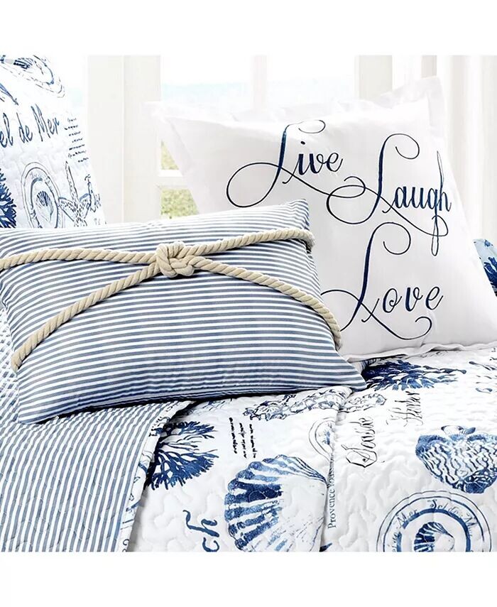 Морские звезды, морские коньки и рифы образуют потрясающий узор на этом двустороннем наборе одеял, который идеально подходит для вашего пляжного дома, спальни или комнаты в общежитии в прибрежном стиле. В комплект из 5 предметов входят соответствующие накладки и декоративные подушки.