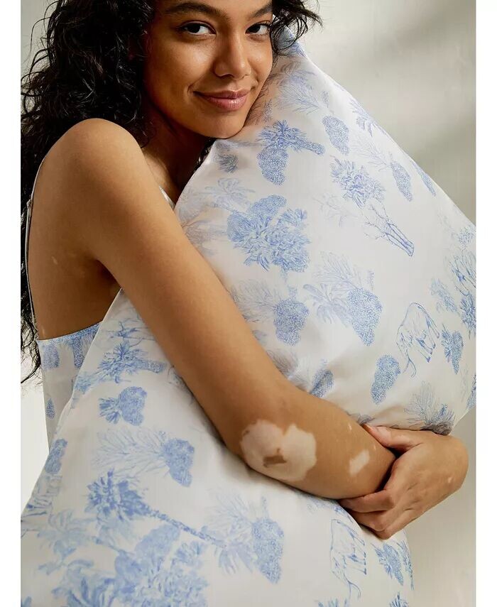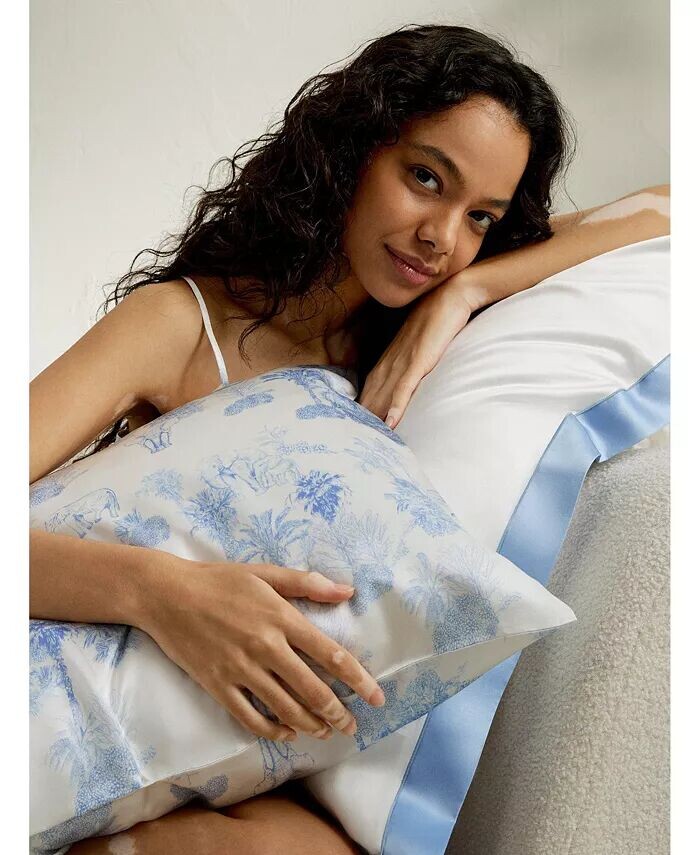 Наша тщательно отобранная шелковая ткань толщиной 19 мм мягкая, гладкая и шелковистая на ощупь. Наволочка имеет форму конверта и не содержит вкладышей. Она выглядит аккуратнее и проще. Дизайн с синим принтом полон романтики и моды, добавляя нотку элегантности и изысканности в вашу спальню.