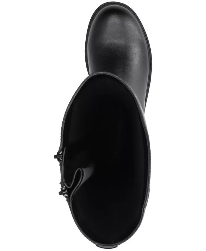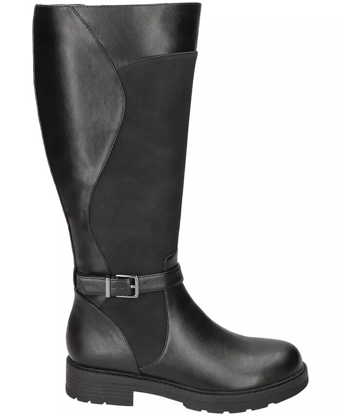 Круглый носок Блочный каблук 1,25 дюйма Доступны в средней, широкой и очень широкой ширине Внутренняя молния Высота голенища 15,25 дюйма измерена на модели 9M Окружность икры 16,25 дюйма измерена на модели 9M Изящный ремешок и орнамент Верх из искусственной кожи; Подошва из термопластической резины Spot Clean;